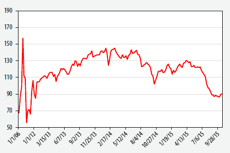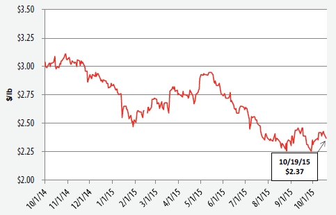 Comex copper prices increased by 3% from September 1st to October 19th, moving from $2.30 to $2.37 per pound. It is still down 16.3% since the beginning of 2015 and down 20.7% over the past twelve months.