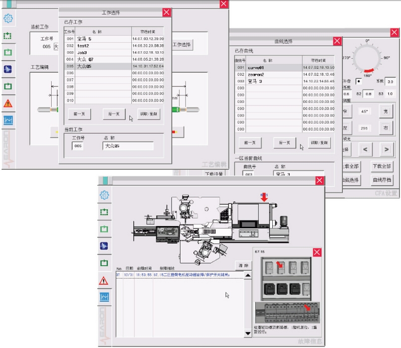 Z5系列全自动双端压接机  主控系统内部设置有2个主数据库,一个用来存储工作参数,一个用来存储端子参考压力曲线;所有数据能够通过U盘或者无线网络传输,实现不同机器间数据共享,大大缩短了新产品及新机器的参数设置时间;系统同时还设有故障诊断数据库,实现自我诊断功能,90%的故障能在系统指示下迅速排除。