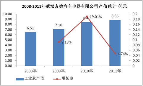 武汉友德汽车电器有限公司1994年成立于武汉,是一家由世界500强企业之一的美国李尔集团和中国东风汽车工业进出口有限公司共同投资的合资企业。2008-2011年,产值规模扩大,预计未来几年公司产值仍将增长。