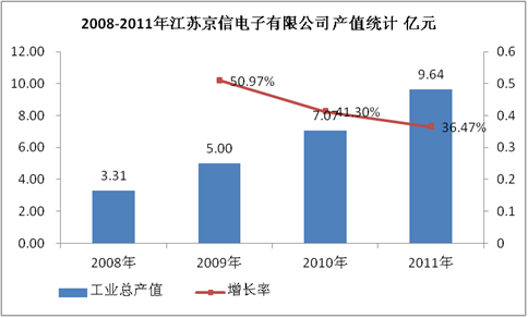 2008-2011年,江苏京信电子有限公产值规模良好发展,2011年企业产值规模达到9.64亿元。预计未来几年,江苏京信电子有限公产值规模仍将持续增长。