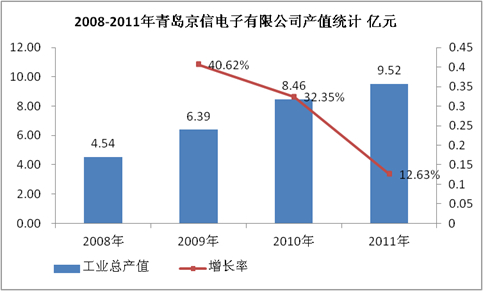2008-2011年,青岛京信电子有限公司产值规模良好发展,2011年企业产值规模超过9亿元。预计未来几年,青岛京信电子有限公司产值规模仍将持续增长。