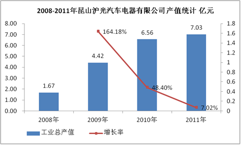 昆山沪光汽车电器有限公司是中国民营资本较大的集产品研发、制造、服务为一体的线束专业生产企业。企业产值增速较快,尤其是2009年,产值增长率达到164.18%,2011年企业产值超过7亿元,预计未来几年企业产值规模将利好发展。