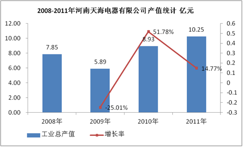 2008-2011年,河南天海电器有限公司产值增长情况良好,2011年,公司产值达到10.25亿元,未来几年随着集团发展,河南天海电器有限公司产值规模将扩大,预计2015年公司产值将超过20亿元。