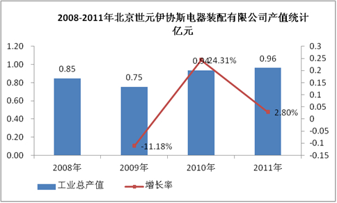 图表 18:2008-2011年北京世元伊协斯电器装配有限公司产值统计 亿元
