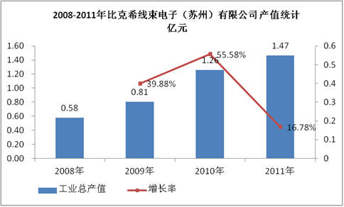 比克希集团是芬兰赫尔辛基证券交易所的一家上市公司,主要为车辆、通讯产业以及电子行业提供线束、电缆和电子产品。目前分别在芬兰、巴西、中国、墨西哥、波兰、爱沙尼亚及俄罗斯都设有子公司,2008-2011年, 比克希线束电子(苏州)有限公司产值规模扩大,预计未来几年公司产值规模将扩大。