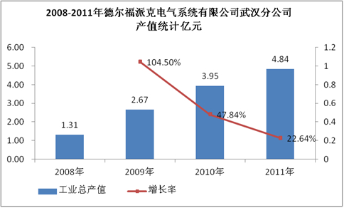 德尔福派克电气系统有限公司武汉分公司主要为神龙汽车有限公司和佛吉亚全兴座椅供货。新公司的建立使得德尔福派克更贴近客户,反应更为迅速,为客户提供世界领先的生产制造与工程设计服务。 2008-2011年,企业产值规模扩大,2011年产值超过4亿元,预计未来几年公司产值规模将扩大。