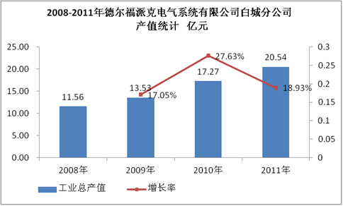 图表 2:2008-2011年德尔福派克电气系统有限公司白城分公司产值统计 亿元